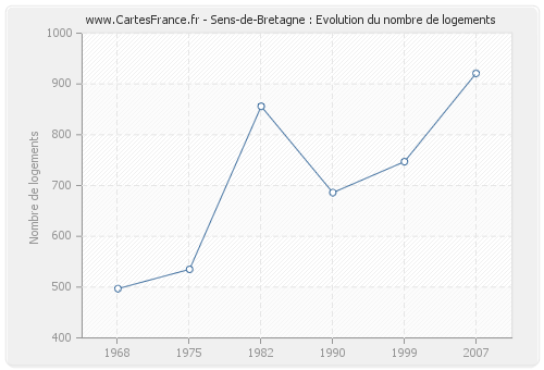 Le nombre de logements de Sens-de-Bretagne était de 921 en 2007, 747 en 1999, 686 en 1990, 856 en 1982, 535 en 1975 et 497 en 1968.