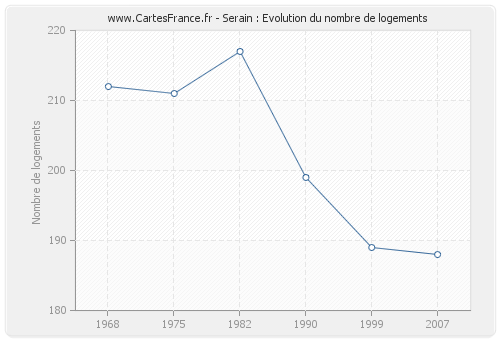Le nombre de logements de Serain était de 188 en 2007, 189 en 1999, 199 en 1990, 217 en 1982, 211 en 1975 et 212 en 1968.