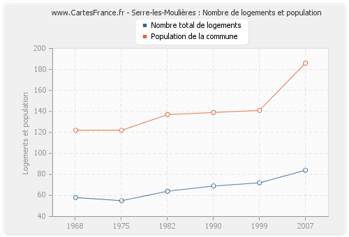 Historique du nombre de logements de Serre-les-Moulières de 1968 à 2007 :