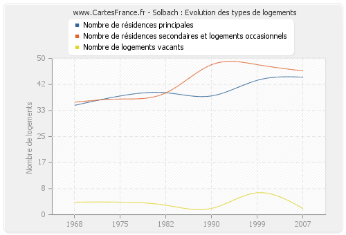 En 2007 les logements de Solbach étaient composés de 44 résidences principales, 46 résidences secondaires ou occasionnels ainsi que 2 logements vacants.