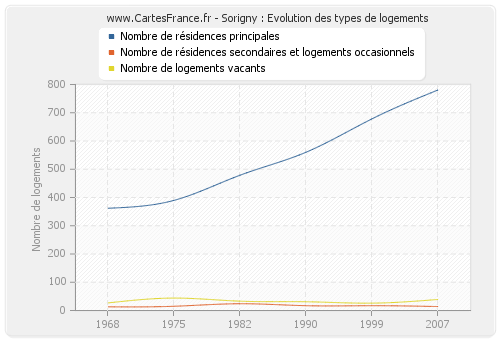 Les graphiques suivant reprennent l'historique du nombre et du type de logements de Sorigny de 1968 à 2007. Le deuxième graphique est tracé en interpolation cubique. Ceci permet d'obtenir plus précisément le nombre de logement de la ville de Sorigny les années ou aucun recensement n'a été effectué.