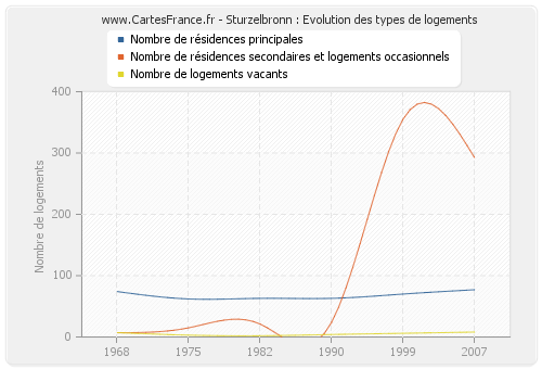 Les graphiques suivant reprennent l'historique du nombre et du type de logements de Sturzelbronn de 1968 à 2007. Le deuxième graphique est tracé en interpolation cubique. Ceci permet d'obtenir plus précisément le nombre de logement du village de Sturzelbronn les années ou aucun recensement n'a été effectué.
