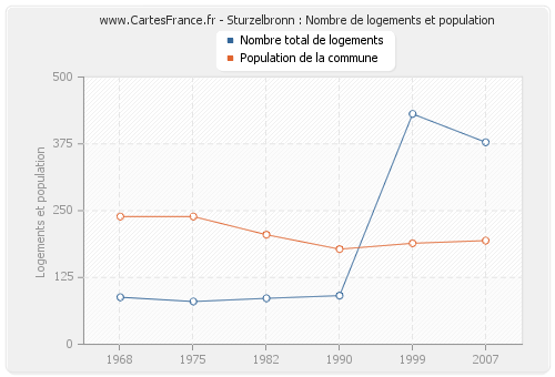 La population de Sturzelbronn était de 194 habitants en 2007, 189 habitants en 1999, 178 habitants en 1990, 205 habitants en 1982, 239 habitants en 1975 et 239 habitants en 1968. Parallèlement, le nombre de logements de Sturzelbronn était de 378 en 2007, 431 en 1999, 91 en 1990, 86 en 1982, 80 en 1975 et 88 en 1968.