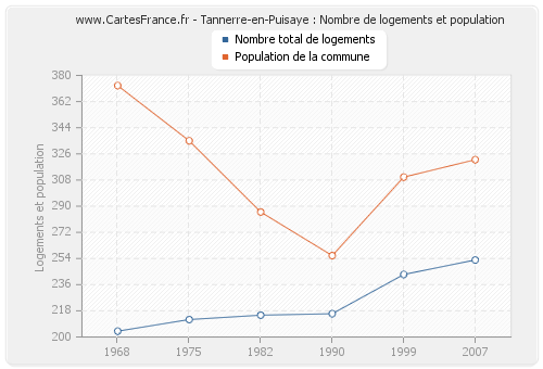 La population de Tannerre-en-Puisaye était de 322 habitants en 2007, 310 habitants en 1999, 256 habitants en 1990, 286 habitants en 1982, 335 habitants en 1975 et 373 habitants en 1968. Parallèlement, le nombre de logements de Tannerre-en-Puisaye était de 253 en 2007, 243 en 1999, 216 en 1990, 215 en 1982, 212 en 1975 et 204 en 1968.