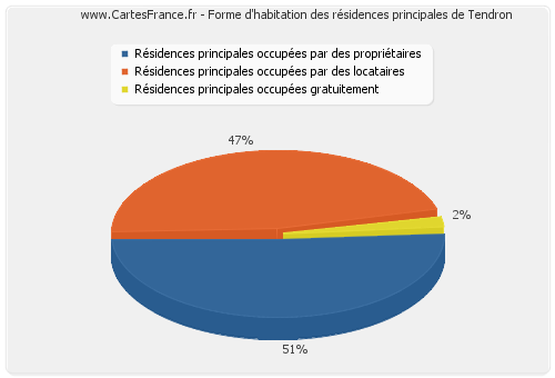 Le Village de Tendron recensait la même année un total de 47 ménages. Les graphiques suivants présentent les statistiques d'habitation de ces ménages de Tendron.