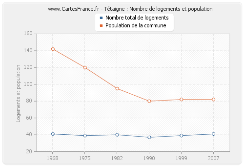 La population de Tétaigne était de 82 habitants en 2007, 82 habitants en 1999, 80 habitants en 1990, 95 habitants en 1982, 120 habitants en 1975 et 142 habitants en 1968. Parallèlement, le nombre de logements de Tétaigne était de 41 en 2007, 39 en 1999, 37 en 1990, 40 en 1982, 39 en 1975 et 41 en 1968.