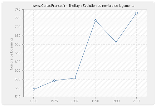 Le nombre de logements de Theillay était de 732 en 2007, 665 en 1999, 715 en 1990, 583 en 1982, 577 en 1975 et 557 en 1968.