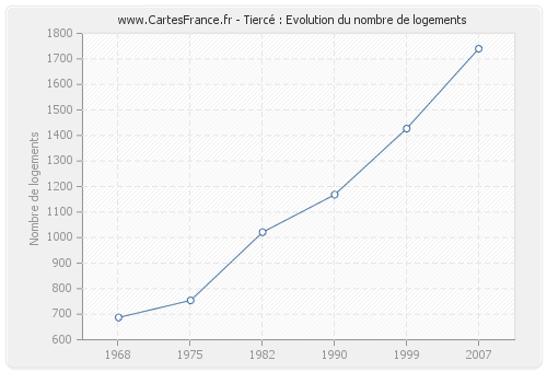 Le nombre de logements de Tiercé était de 1 740 en 2007, 1 427 en 1999, 1 168 en 1990, 1 021 en 1982, 754 en 1975 et 687 en 1968.