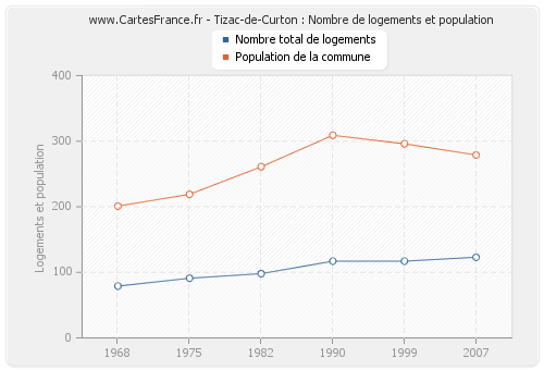 La population de Tizac-de-Curton était de 279 habitants en 2007, 296 habitants en 1999, 309 habitants en 1990, 261 habitants en 1982, 219 habitants en 1975 et 201 habitants en 1968. Parallèlement, le nombre de logements de Tizac-de-Curton était de 123 en 2007, 117 en 1999, 117 en 1990, 98 en 1982, 91 en 1975 et 79 en 1968.