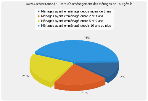 - Nombre de ménages de Tourgéville ayant emménagé depuis 10 ans ou plus : 210