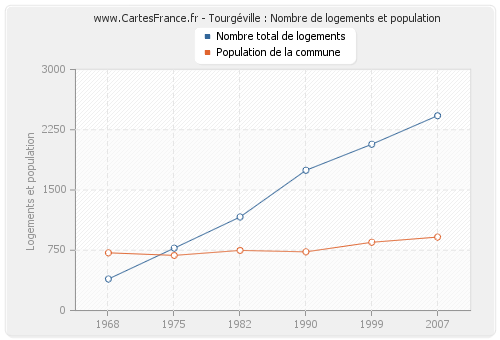 La population de Tourgéville était de 914 habitants en 2007, 849 habitants en 1999, 730 habitants en 1990, 748 habitants en 1982, 686 habitants en 1975 et 718 habitants en 1968. Parallèlement, le nombre de logements de Tourgéville était de 2 425 en 2007, 2 069 en 1999, 1 745 en 1990, 1 164 en 1982, 776 en 1975 et 392 en 1968.