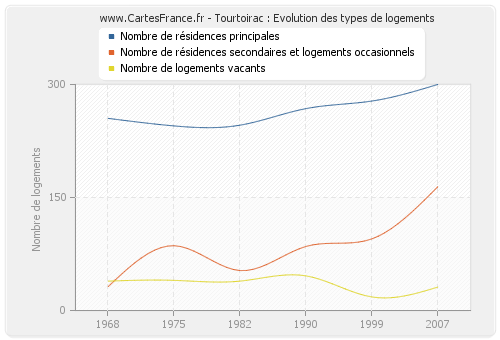 Les graphiques suivant reprennent l'historique du nombre et du type de logements de Tourtoirac de 1968 à 2007. Le deuxième graphique est tracé en interpolation cubique. Ceci permet d'obtenir plus précisément le nombre de logement du village de Tourtoirac les années ou aucun recensement n'a été effectué.