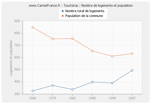La population de Tourtoirac était de 633 habitants en 2007, 611 habitants en 1999, 654 habitants en 1990, 756 habitants en 1982, 754 habitants en 1975 et 849 habitants en 1968. Parallèlement, le nombre de logements de Tourtoirac était de 495 en 2007, 391 en 1999, 399 en 1990, 338 en 1982, 371 en 1975 et 326 en 1968.