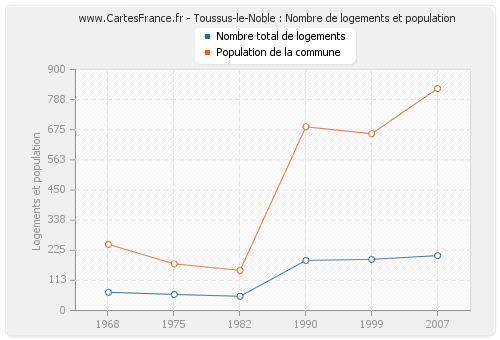 La population de Toussus-le-Noble était de 829 habitants en 2007, 660 habitants en 1999, 686 habitants en 1990, 150 habitants en 1982, 174 habitants en 1975 et 247 habitants en 1968. Parallèlement, le nombre de logements de Toussus-le-Noble était de 205 en 2007, 191 en 1999, 187 en 1990, 53 en 1982, 60 en 1975 et 68 en 1968.