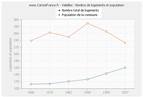 La population de Valeilles était de 233 habitants en 2007, 266 habitants en 1999, 290 habitants en 1990, 250 habitants en 1982, 263 habitants en 1975 et 239 habitants en 1968. Parallèlement, le nombre de logements de Valeilles était de 161 en 2007, 144 en 1999, 127 en 1990, 121 en 1982, 114 en 1975 et 113 en 1968.