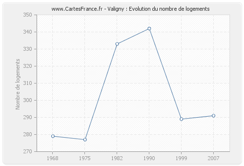 Le nombre de logements de Valigny était de 291 en 2007, 289 en 1999, 342 en 1990, 333 en 1982, 277 en 1975 et 279 en 1968.