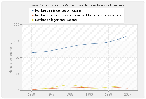 Les graphiques suivant reprennent l'historique du nombre et du type de logements de Valines de 1968 à 2007. Le deuxième graphique est tracé en interpolation cubique. Ceci permet d'obtenir plus précisément le nombre de logement du village de Valines les années ou aucun recensement n'a été effectué.