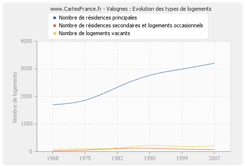 Les graphiques suivant reprennent l'historique du nombre et du type de logements de Valognes de 1968 à 2007. Le deuxième graphique est tracé en interpolation cubique. Ceci permet d'obtenir plus précisément le nombre de logement de la ville de Valognes les années ou aucun recensement n'a été effectué.