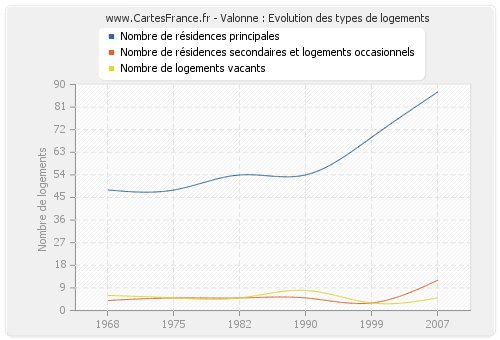 Les graphiques suivant reprennent l'historique du nombre et du type de logements de Valonne de 1968 à 2007. Le deuxième graphique est tracé en interpolation cubique. Ceci permet d'obtenir plus précisément le nombre de logement du village de Valonne les années ou aucun recensement n'a été effectué.