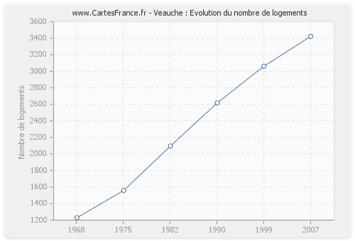 La population de Veauche était de 8 307 habitants en 2007, 8 055 habitants en 1999, 7 282 habitants en 1990, 5 706 habitants en 1982, 4 027 habitants en 1975 et 3 197 habitants en 1968. Parallèlement, le nombre de logements de Veauche était de 3 421 en 2007, 3 061 en 1999, 2 617 en 1990, 2 095 en 1982, 1 559 en 1975 et 1 228 en 1968.