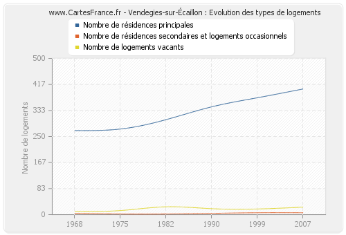 Les graphiques suivant reprennent l'historique du nombre et du type de logements de Vendegies-sur-Écaillon de 1968 à 2007. Le deuxième graphique est tracé en interpolation cubique. Ceci permet d'obtenir plus précisément le nombre de logement du village de Vendegies-sur-Écaillon les années ou aucun recensement n'a été effectué.