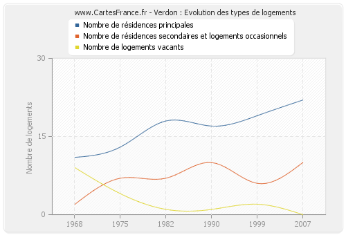 - Nombre de résidences principales de Verdon en 2007 : 22