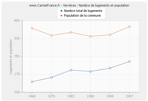 La population de Verrières était de 375 habitants en 2007, 341 habitants en 1999, 334 habitants en 1990, 351 habitants en 1982, 338 habitants en 1975 et 368 habitants en 1968. Parallèlement, le nombre de logements de Verrières était de 229 en 2007, 201 en 1999, 187 en 1990, 193 en 1982, 162 en 1975 et 144 en 1968.