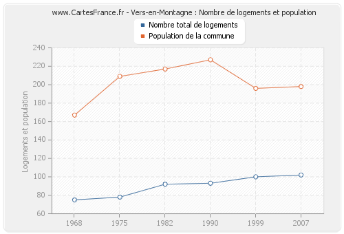 Historique du nombre de logements de Vers-en-Montagne de 1968 à 2007 :