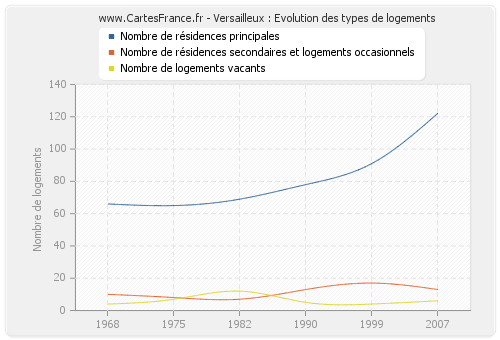 Le nombre de logements de Versailleux était de 141 en 2007, 112 en 1999, 96 en 1990, 88 en 1982, 80 en 1975 et 80 en 1968.