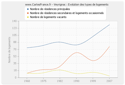 - Nombre de résidences principales de Veyrignac en 2007 : 131