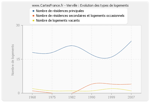 En 2007 les logements de Vierville étaient composés de 23 résidences principales, 4 résidences secondaires ou occasionnels ainsi que 1 logements vacants.