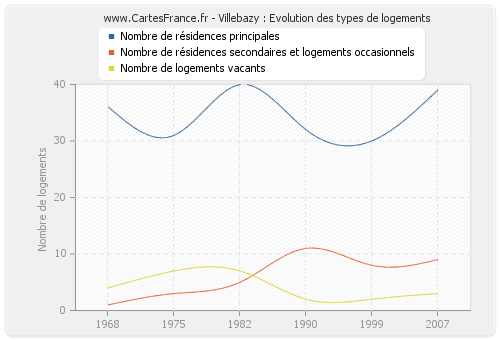- Nombre de résidences principales de Villebazy en 2007 : 39