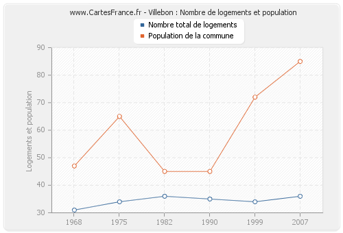 La population de Villebon était de 85 habitants en 2007, 72 habitants en 1999, 45 habitants en 1990, 45 habitants en 1982, 65 habitants en 1975 et 47 habitants en 1968. Parallèlement, le nombre de logements de Villebon était de 36 en 2007, 34 en 1999, 35 en 1990, 36 en 1982, 34 en 1975 et 31 en 1968.