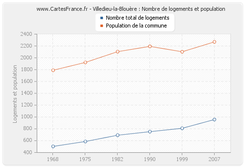 La population de Villedieu-la-Blouère était de 2 269 habitants en 2007, 2 102 habitants en 1999, 2 193 habitants en 1990, 2 104 habitants en 1982, 1 922 habitants en 1975 et 1 790 habitants en 1968. Parallèlement, le nombre de logements de Villedieu-la-Blouère était de 957 en 2007, 809 en 1999, 752 en 1990, 692 en 1982, 586 en 1975 et 503 en 1968.