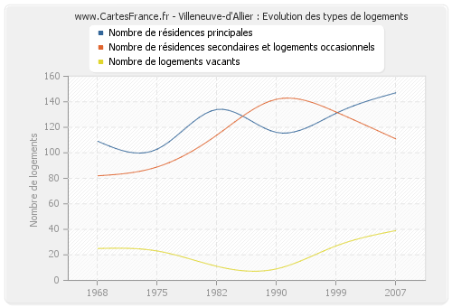 Historique du nombre de logements de Villeneuve-d'Allier de 1968 à 2007 :