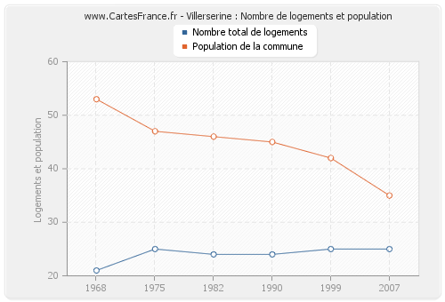 La population de Villerserine était de 35 habitants en 2007, 42 habitants en 1999, 45 habitants en 1990, 46 habitants en 1982, 47 habitants en 1975 et 53 habitants en 1968. Parallèlement, le nombre de logements de Villerserine était de 25 en 2007, 25 en 1999, 24 en 1990, 24 en 1982, 25 en 1975 et 21 en 1968.