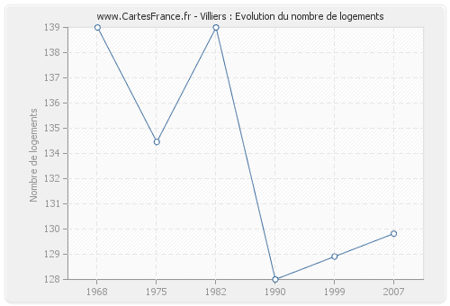 Le nombre de logements de Villiers était de 130 en 2007, 129 en 1999, 128 en 1990, 139 en 1982, 134 en 1975 et 139 en 1968.