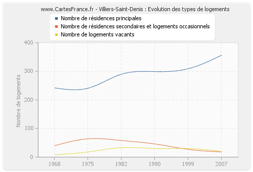 Les graphiques suivant reprennent l'historique du nombre et du type de logements de Villiers-Saint-Denis de 1968 à 2007. Le deuxième graphique est tracé en interpolation cubique. Ceci permet d'obtenir plus précisément le nombre de logement du village de Villiers-Saint-Denis les années ou aucun recensement n'a été effectué.