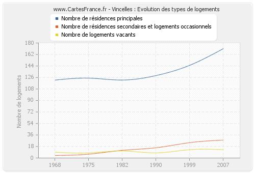 En 2007 les logements de Vincelles étaient composés de 171 résidences principales, 28 résidences secondaires ou occasionnels ainsi que 13 logements vacants.