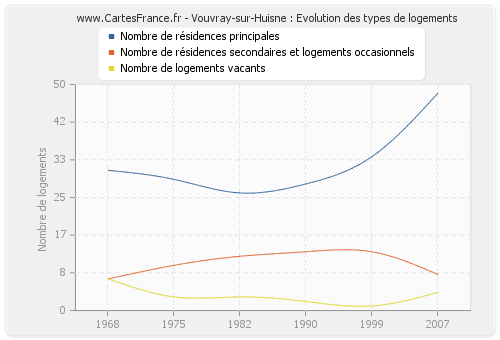 Les graphiques suivant reprennent l'historique du nombre et du type de logements de Vouvray-sur-Huisne de 1968 à 2007. Le deuxième graphique est tracé en interpolation cubique. Ceci permet d'obtenir plus précisément le nombre de logement du village de Vouvray-sur-Huisne les années ou aucun recensement n'a été effectué.