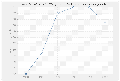 Le nombre de logements de Wissignicourt était de 59 en 2007, 64 en 1999, 64 en 1990, 62 en 1982, 49 en 1975 et 42 en 1968.