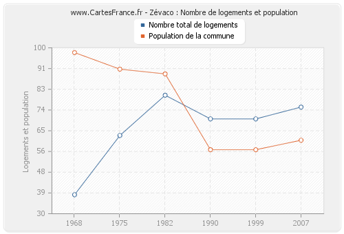 La population de Zévaco était de 61 habitants en 2007, 57 habitants en 1999, 57 habitants en 1990, 89 habitants en 1982, 91 habitants en 1975 et 98 habitants en 1968. Parallèlement, le nombre de logements de Zévaco était de 75 en 2007, 70 en 1999, 70 en 1990, 80 en 1982, 63 en 1975 et 38 en 1968.