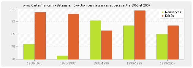 Artemare : évolution des naissances et décès de 1968 à 2007