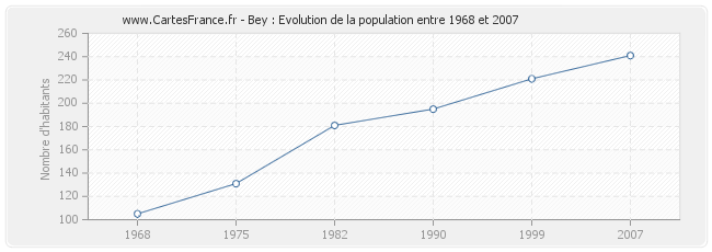 La population de Bey était de 241 habitants en 2007, 221 habitants en 1999, 195 habitants en 1990, 181 habitants en 1982, 131 habitants en 1975 et 105 habitants en 1968.