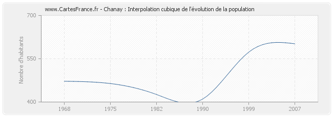 Cette courbe reprend l'historique de la population de Chanay de 1968 à 2007 en interpolation cubique. Ceci permet d'obtenir plus précisément la population de la commune de Chanay les années ou aucun recensement n'a été effectué.