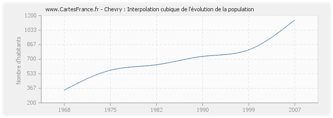 Cette courbe reprend l'historique de la population de Chevry de 1968 à 2007 en interpolation cubique. Ceci permet d'obtenir plus précisément la population de la commune de Chevry les années ou aucun recensement n'a été effectué.