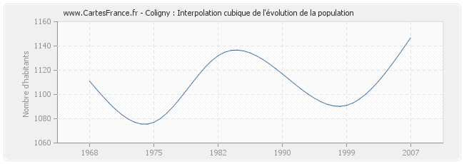 Cette courbe reprend l'historique de la population de Coligny de 1968 à 2007 en interpolation cubique. Ceci permet d'obtenir plus précisément la population de la commune de Coligny les années ou aucun recensement n'a été effectué.