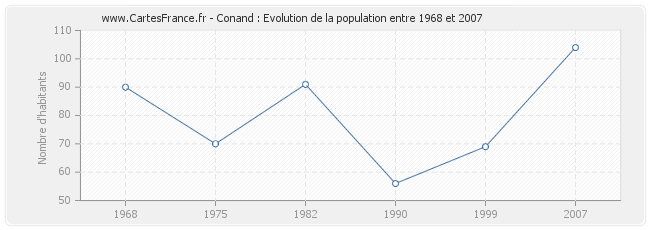 Cette courbe reprend l'historique de la population de Conand de 1968 à 2007 en interpolation cubique. Ceci permet d'obtenir plus précisément la population de la commune de Conand les années ou aucun recensement n'a été effectué.