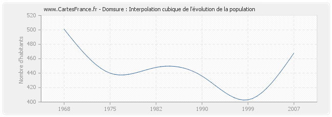 Cette courbe reprend l'historique de la population de Domsure de 1968 à 2007 en interpolation cubique. Ceci permet d'obtenir plus précisément la population de la commune de Domsure les années ou aucun recensement n'a été effectué.