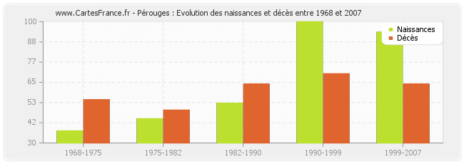 Pérouges : évolution des naissances et décès de 1968 à 2007
